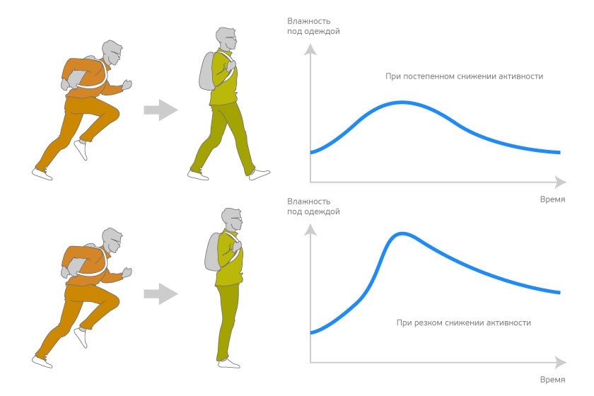 Предположим, одевшись в термобелье, утеплитель и мембранную куртку, мы идем с рюкзаком в горку. Все три слоя одежды прекрасно справляются с задачами теплоизоляции и отвода лишней влаги. Но что будет, если мы резко прекратим движение?