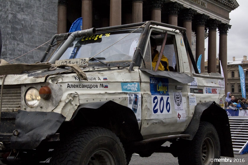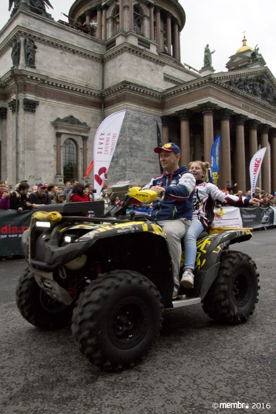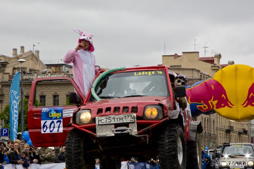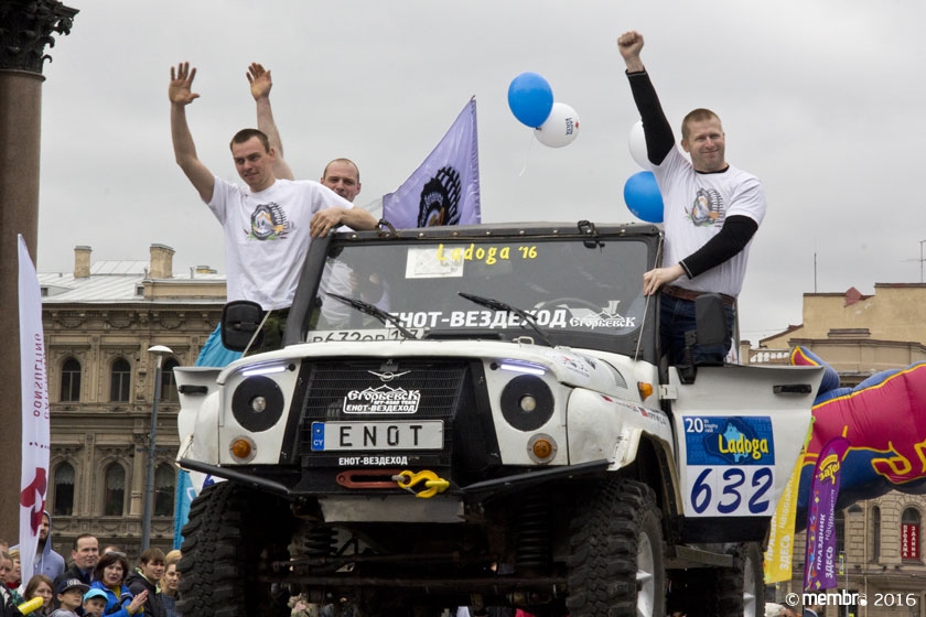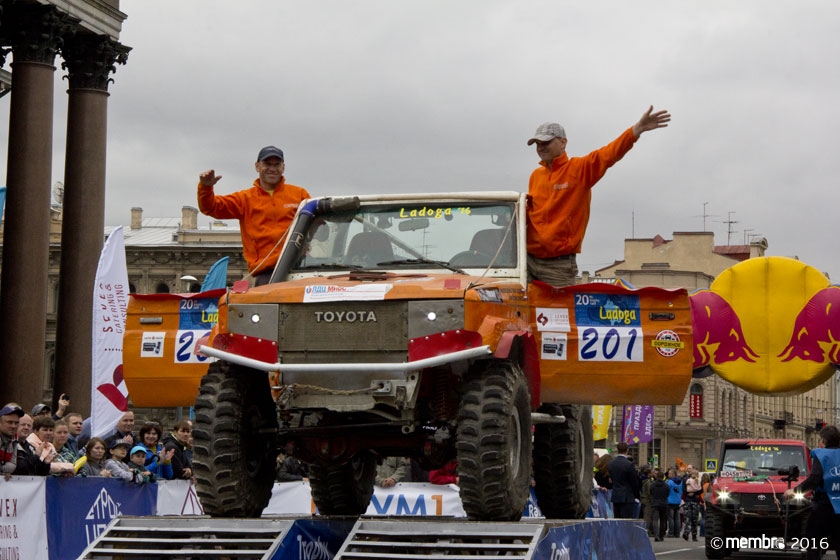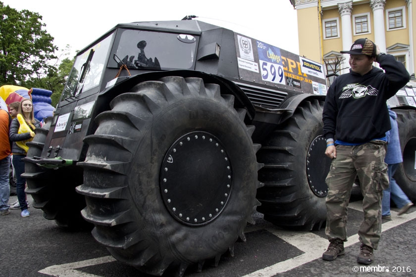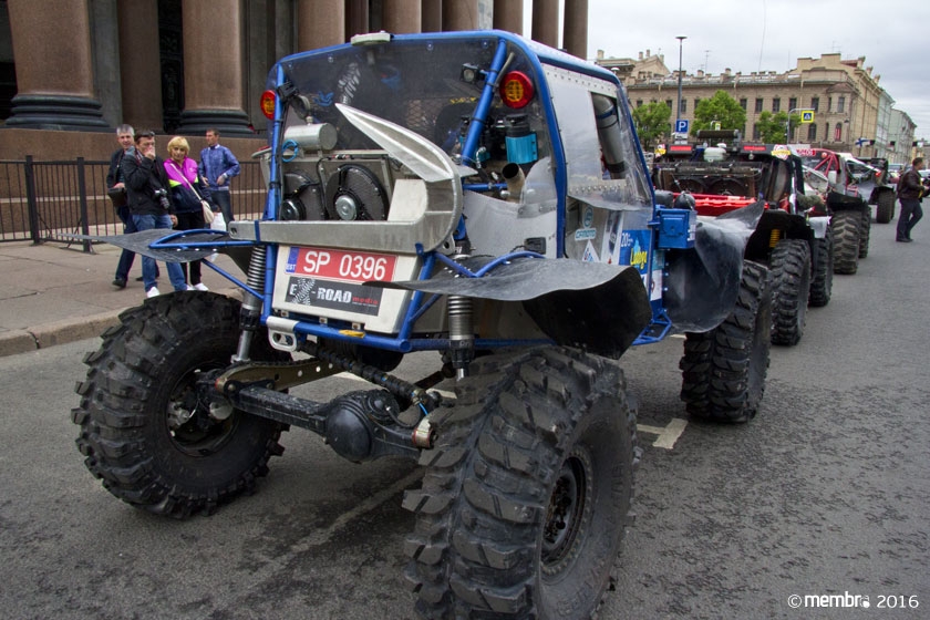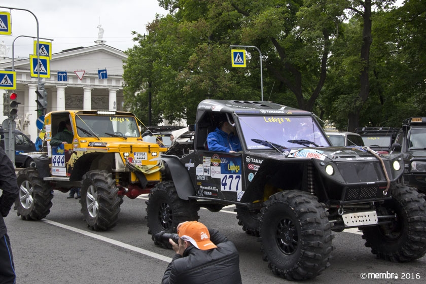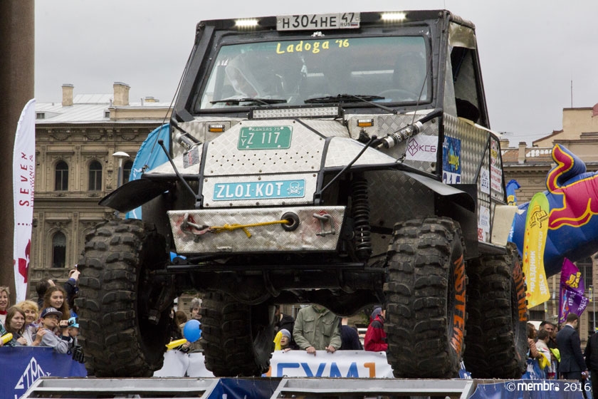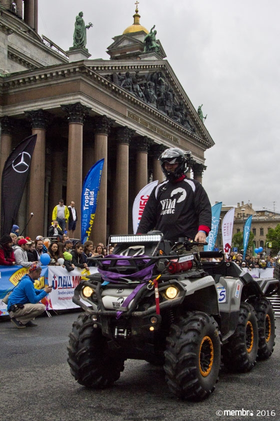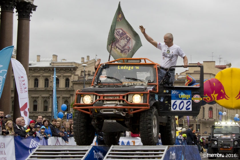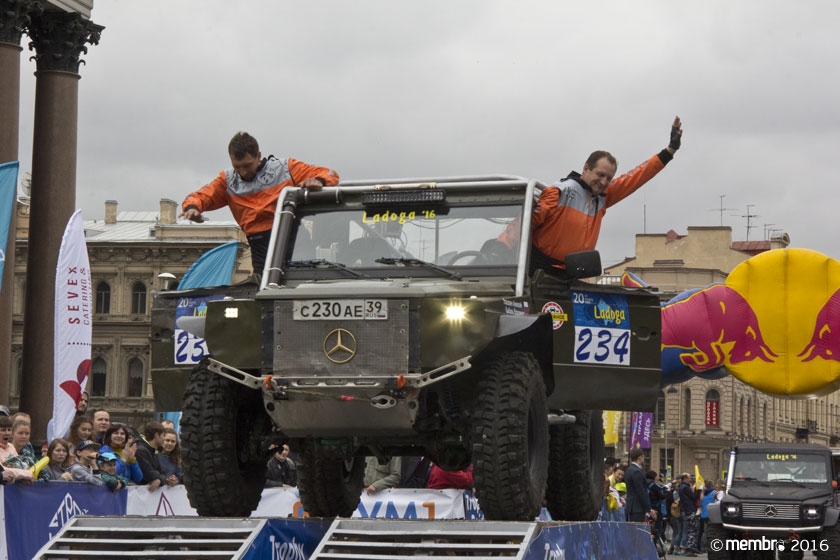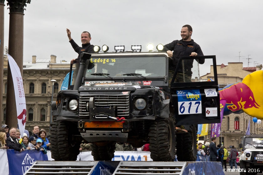 Поднимаясь на подиум, участники представляли свою команду и транспортное средство. У многих экипажей были собственные девизы — своего рода визитные карточки: «Просто звери», «Жертвы гаражной фантазии», «Только вперед», «Мы не сдаемся»... Зрители, организаторы и, казалось, даже статуи апостолов Петра, Павла и Иоанна с фронтона Исаакиевского собора провожали экипажи пожеланиями удачи и победы. Даже серое низкое небо над площадью выглядело по-внедорожному и обещало командам все разновидности земных и небесных хлябей.