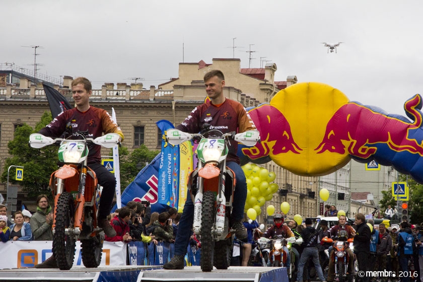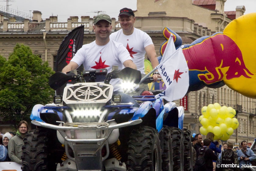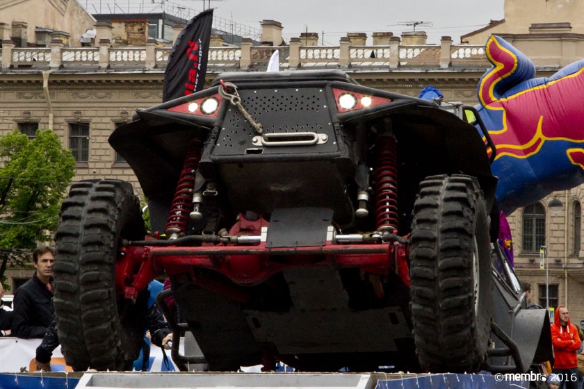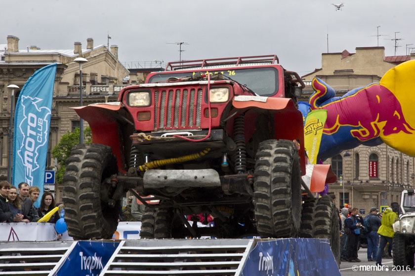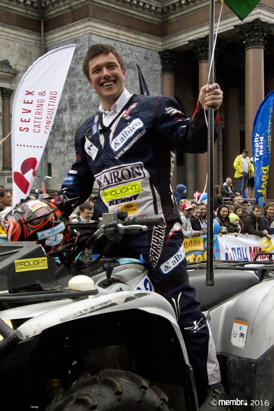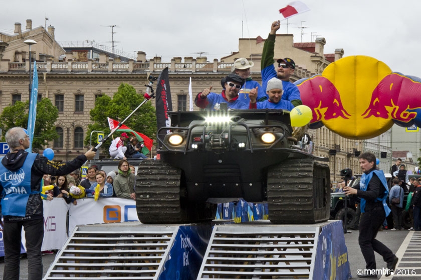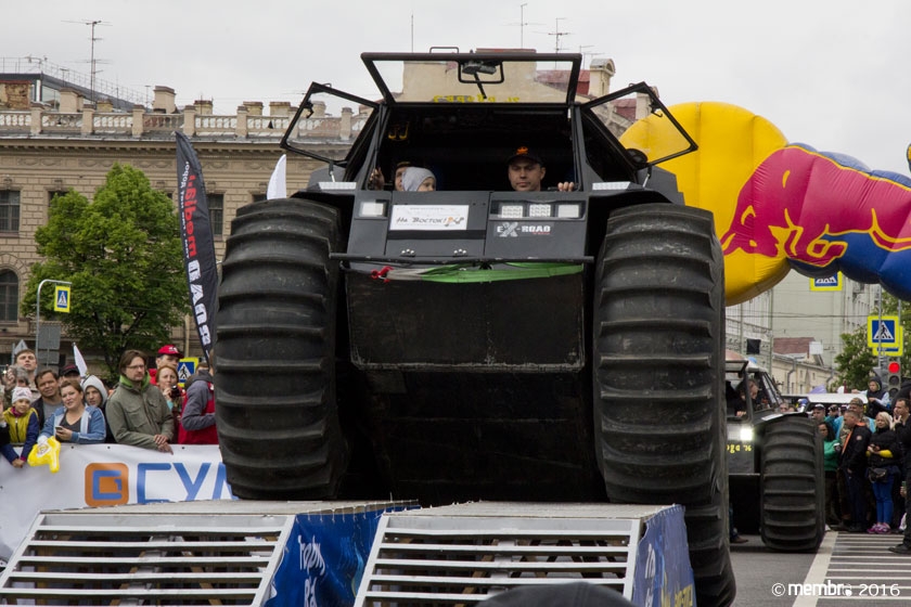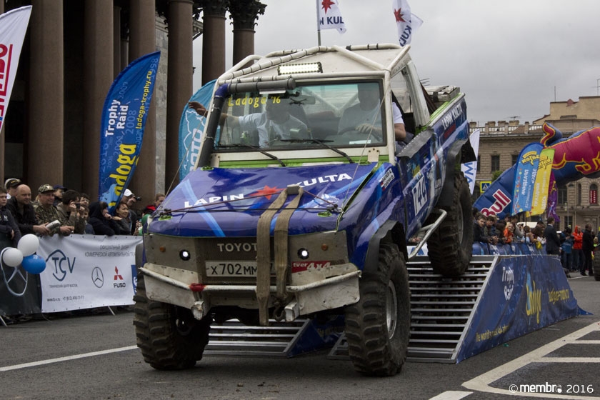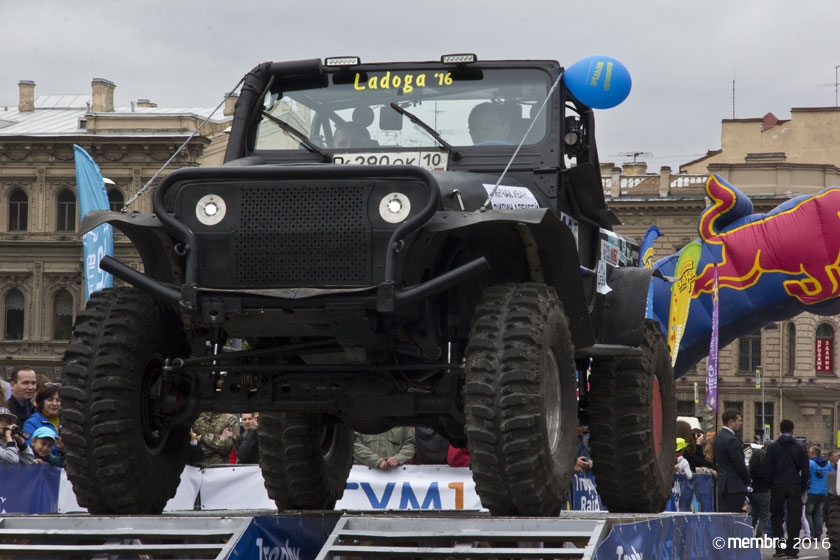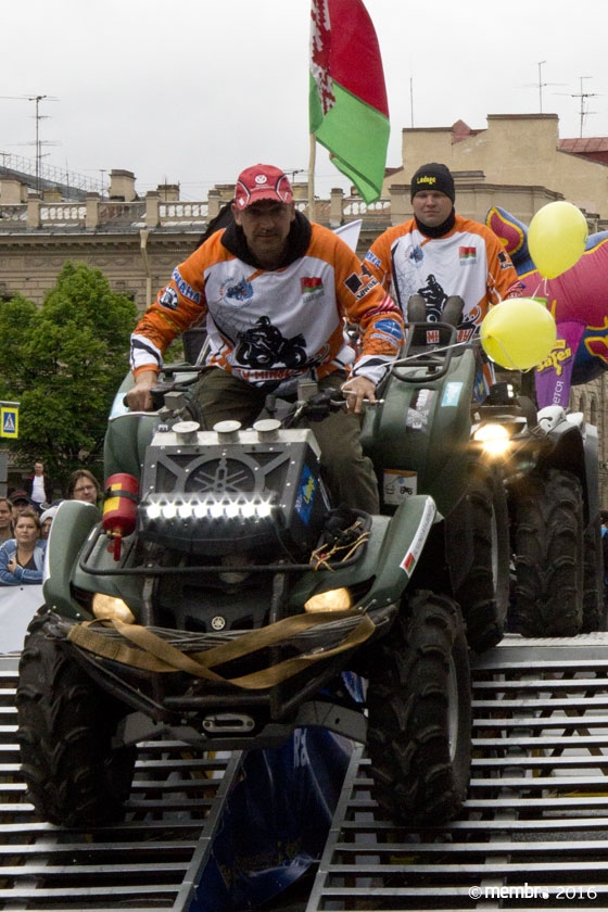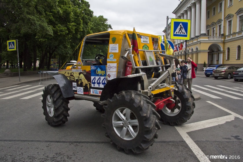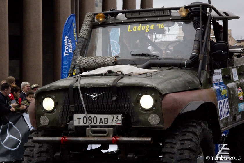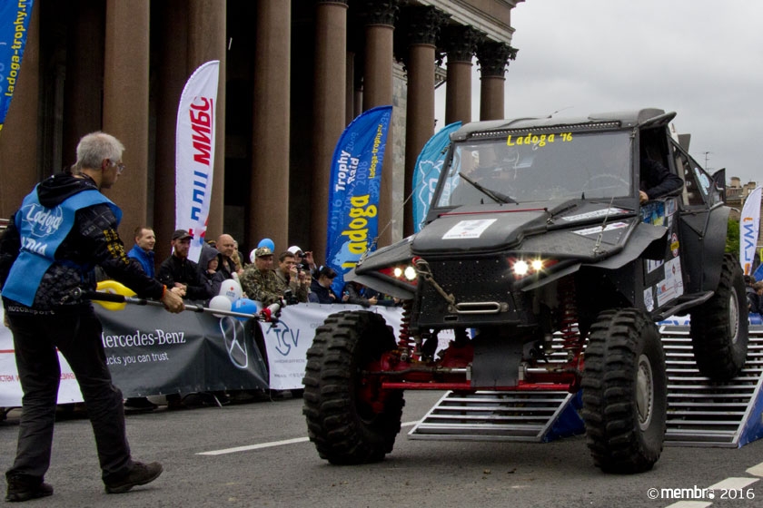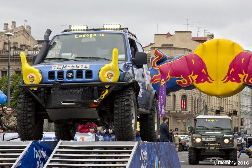 Поднимаясь на подиум, участники представляли свою команду и транспортное средство. У многих экипажей были собственные девизы — своего рода визитные карточки: «Просто звери», «Жертвы гаражной фантазии», «Только вперед», «Мы не сдаемся»... Зрители, организаторы и, казалось, даже статуи апостолов Петра, Павла и Иоанна с фронтона Исаакиевского собора провожали экипажи пожеланиями удачи и победы. Даже серое низкое небо над площадью выглядело по-внедорожному и обещало командам все разновидности земных и небесных хлябей.