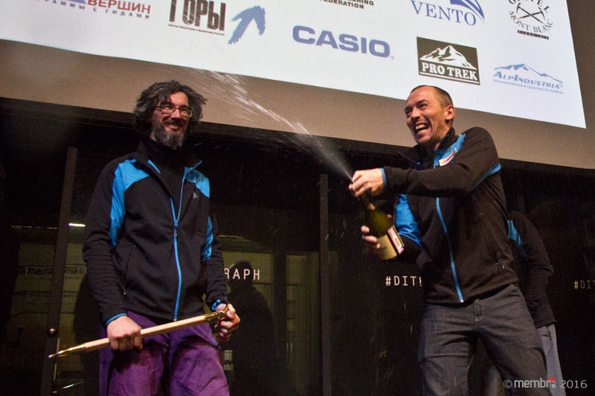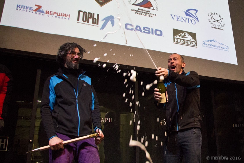 Награждение призеров чемпионата России по альпинизму 2016 в ледово-снежном классе. Алексей Овчинников, ведущий вечера, и Егор Суздальцев (Кемеровская область, Новокузнецк)